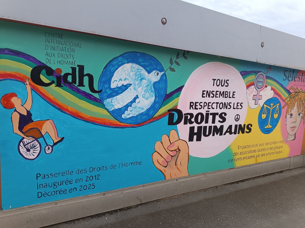 Lâinauguration, organisĂ©e le 13 septembre 2025, a permis de dĂ©couvrir lâensemble des 15 fresques rĂ©alisĂ©es par les enfants. RĂ©unies, elles forment aujourdâhui une Ćuvre unique et collective, habillant la passerelle des Droits de lâHomme et portant un message fort, empreint de sens et de valeurs.