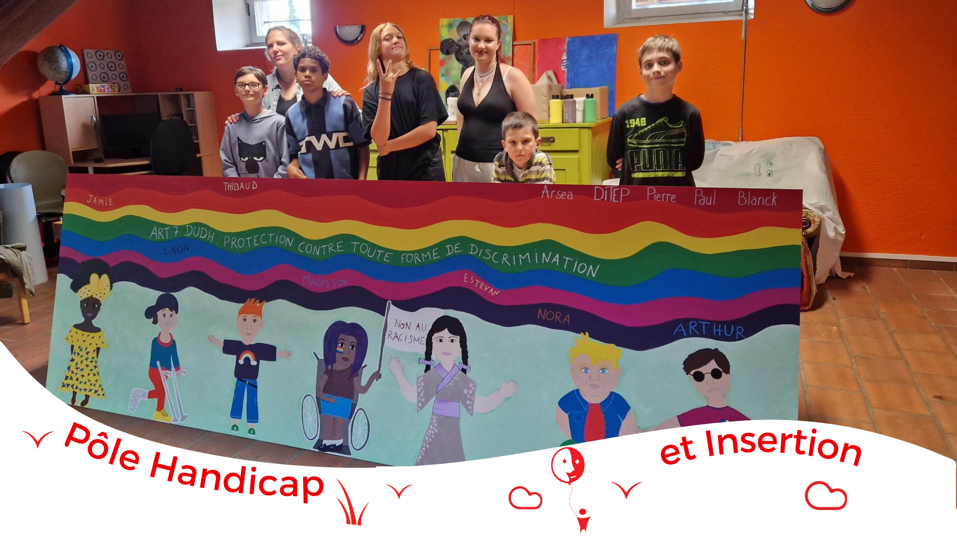 Au DITEP, six jeunes, encadrĂ©s par deux Ă©ducatrices, se sont lancĂ©s dans lâaventure. AprĂšs des temps dâĂ©change autour des droits, le choix du droit Ă reprĂ©senter, puis un travail de rĂ©flexion, dâidĂ©es et dâesquisses, ils se sont investis collectivement pour donner vie Ă leur crĂ©ation.